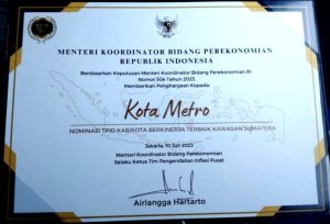 Kota Metro mendapatkan penghargaan nominasi Tim Pengendalian Inflasi Daerah (TPID) Kabupaten/ Kota berkinerja terbaik kawasan Sumatera berdasarkan keputusan Menteri Koordinator Bidang Perekonomian RI Nomor 304 Tahun 2023.